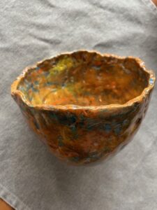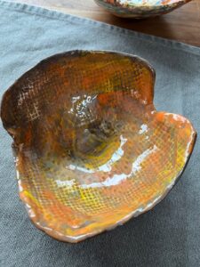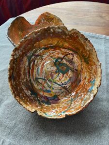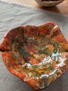Her art stems from the beauty of abstract in pottery and paintings by experimenting with colours and texture. In pottery, she uses both stoneware and Raku clay, and in her jewellery, she creates one-of a-kind items combining her own ceramic beads, world findings, and both new and recycled silver.